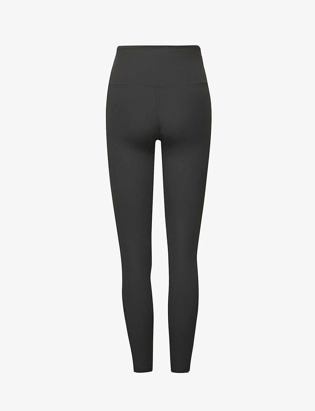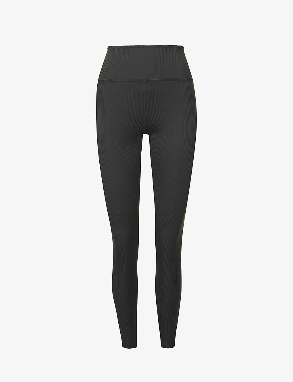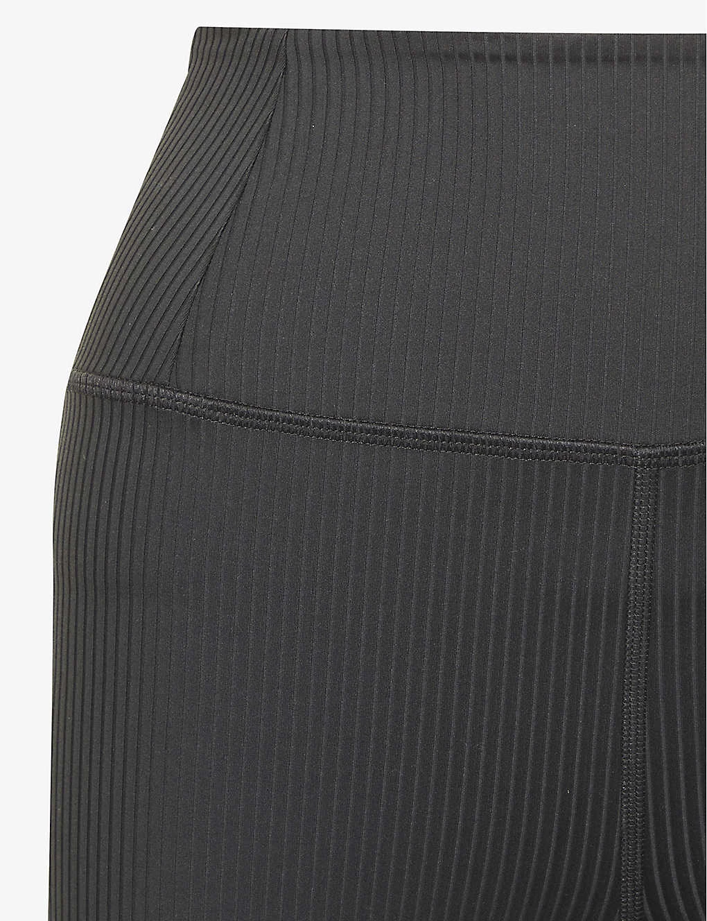 - Slim fit, high rise, structured elasticated waistband, exposed seam stitching, all-over ribbed texture