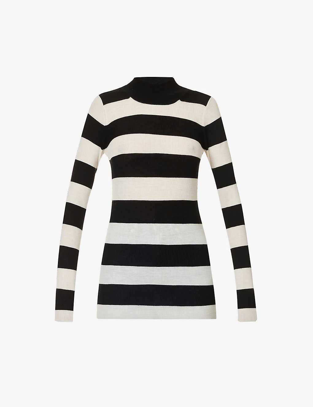 - Slim fit, high neck, long sleeves, all-over ribbed texture, stripe pattern, fine knit