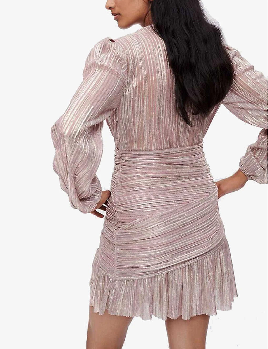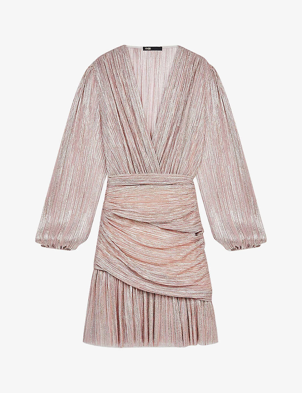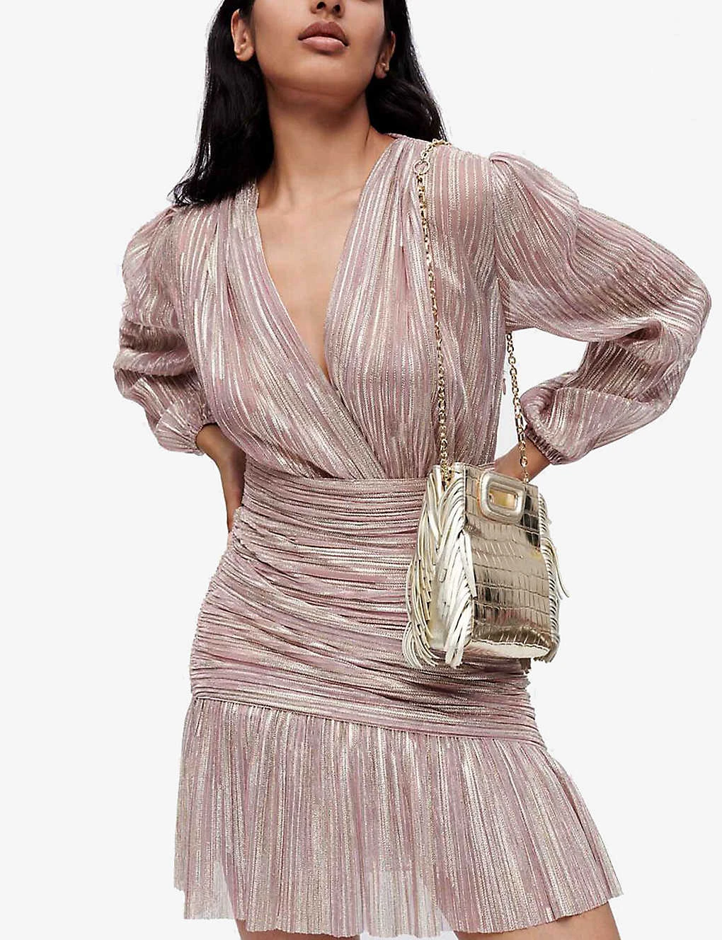 - Plunging V-neck, long balloon shaped sleeves, elasticated cuffs, oversized waistband, pleated hem, all-over metallic finish, fully lined