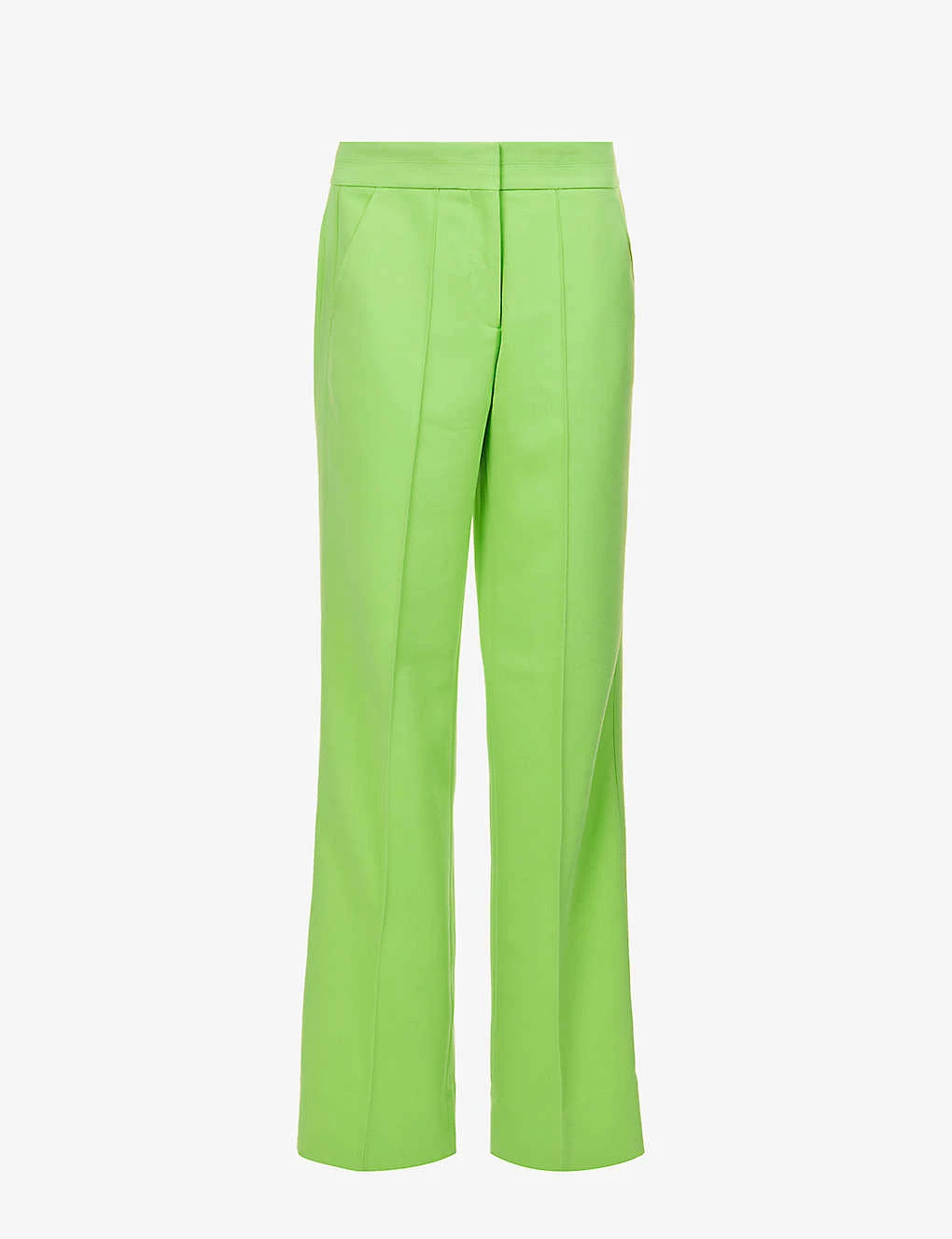 - Regular fit, mid-rise, flared leg, structured waistband, two slip pockets at front, darts at back, two welt pockets at back, pressed centre creases