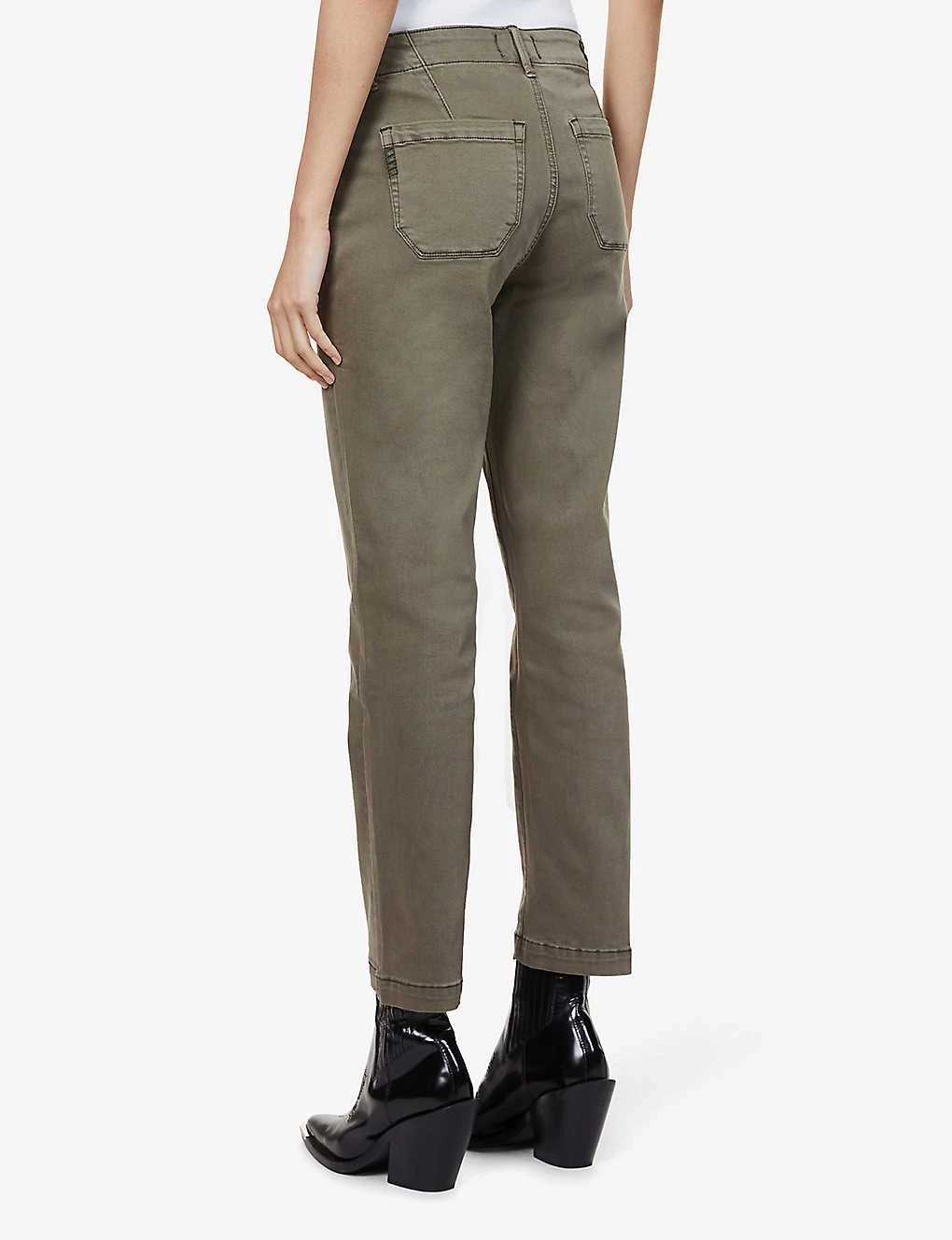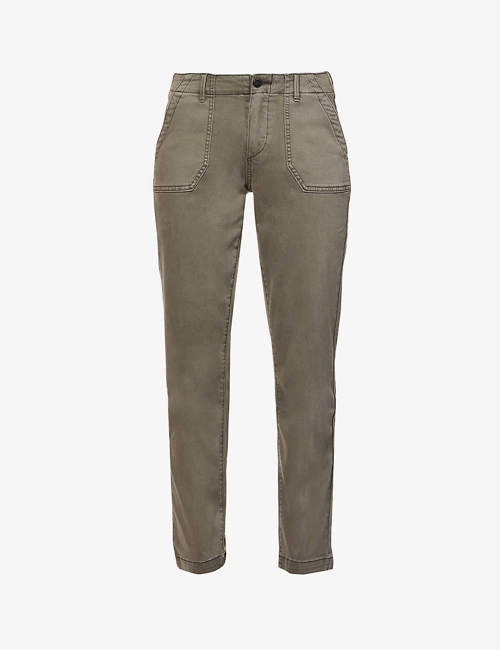 - Slim fit, mid-rise, tapered leg, belt loops, two slip pockets at front, branded fastening button, two patch pockets at back, two darts at back, contrast stitching