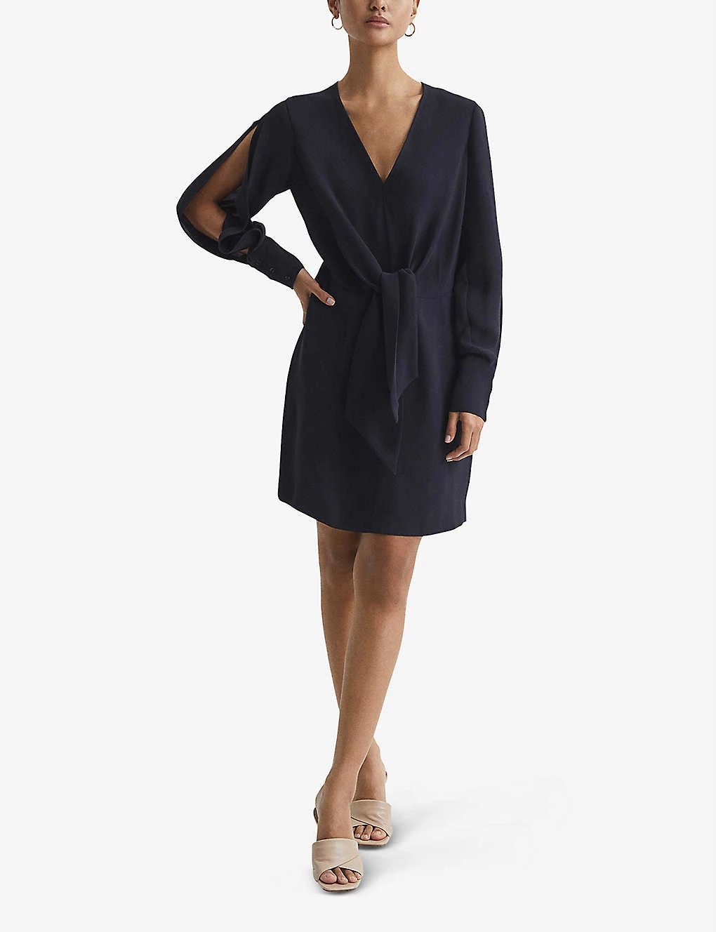 - V-neck, cut-out long sleeves, fitted cuffs, draped, self-tie fastening at front, mini skirt
