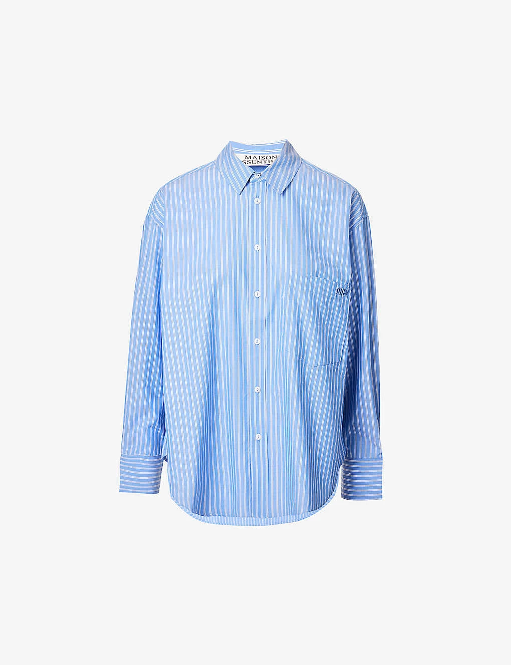 - Regular-fit, round neck, long sleeves, double-buttoned cuffs, pearlescent buttons, all-over striped pattern, patch pocket at chest, embroidered branding at chest and cuffs, curved hem