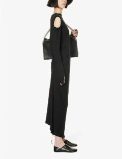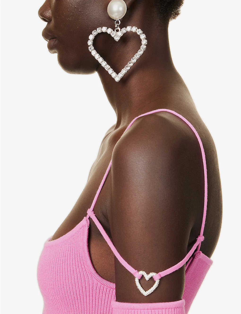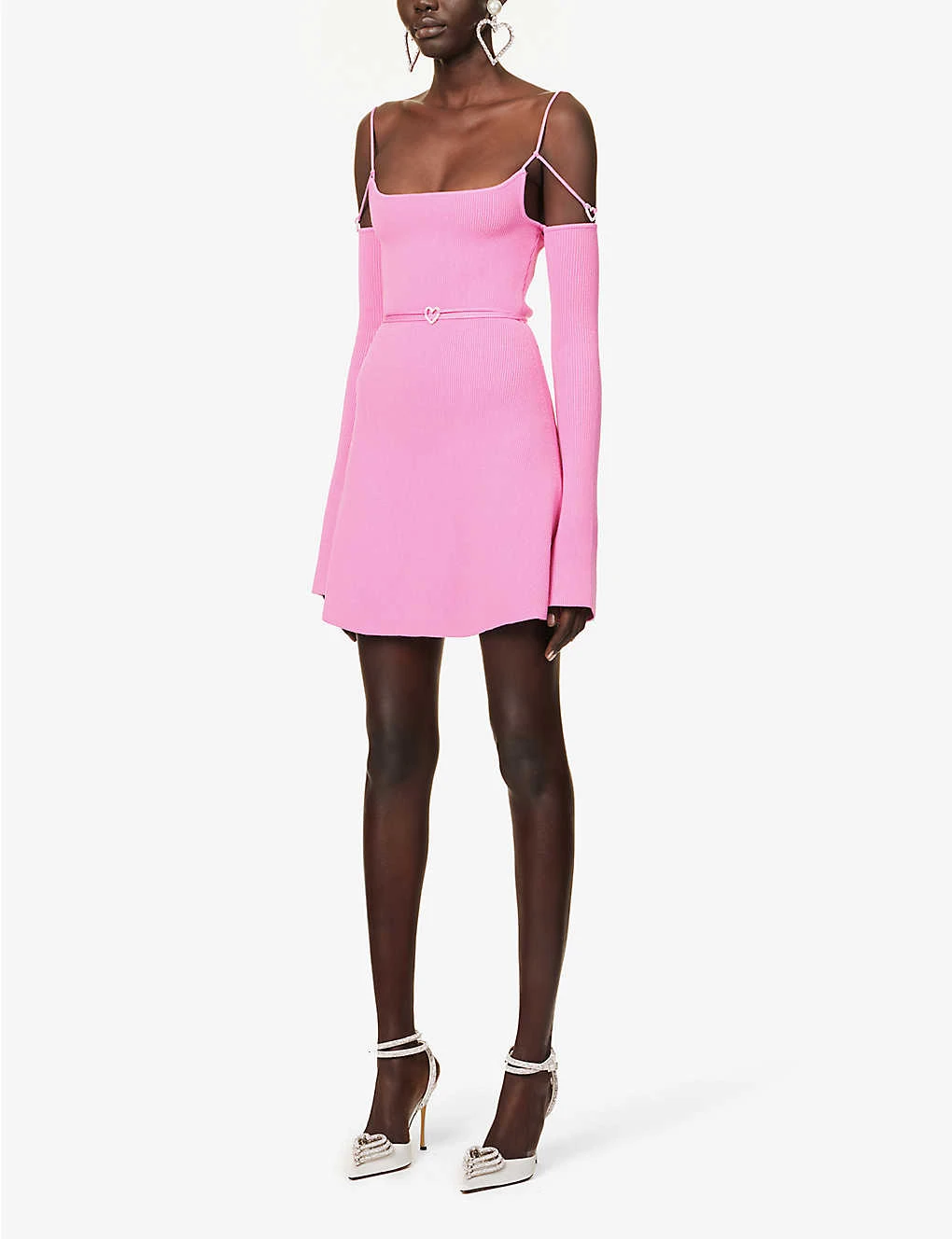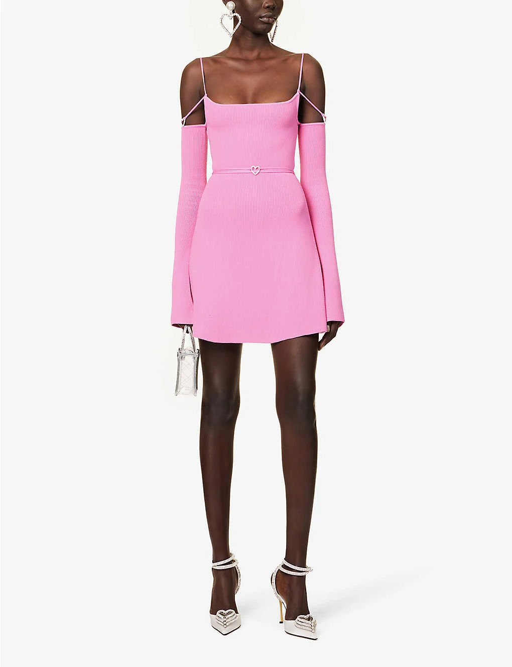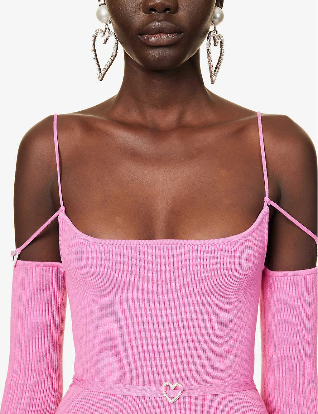 - Slim fit, square neckline, exposed shoulders, adjustable straps with embellished charms, long flared sleeves, self-tie at waist with embellished charm, medium knit, ribbed texture