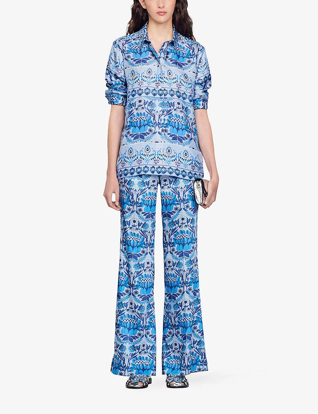 Sandro Peridot Floral-print Wide-leg Mid-rise Woven Trousers