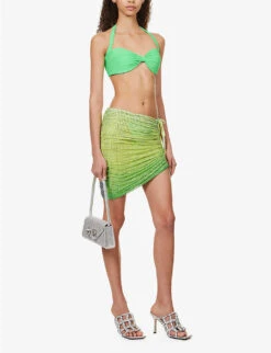 - Asymmetric neckline, one shoulder strap, padded, removable pads, high leg, mid-coverage at back, all-over crystal embellishment, gradient pattern