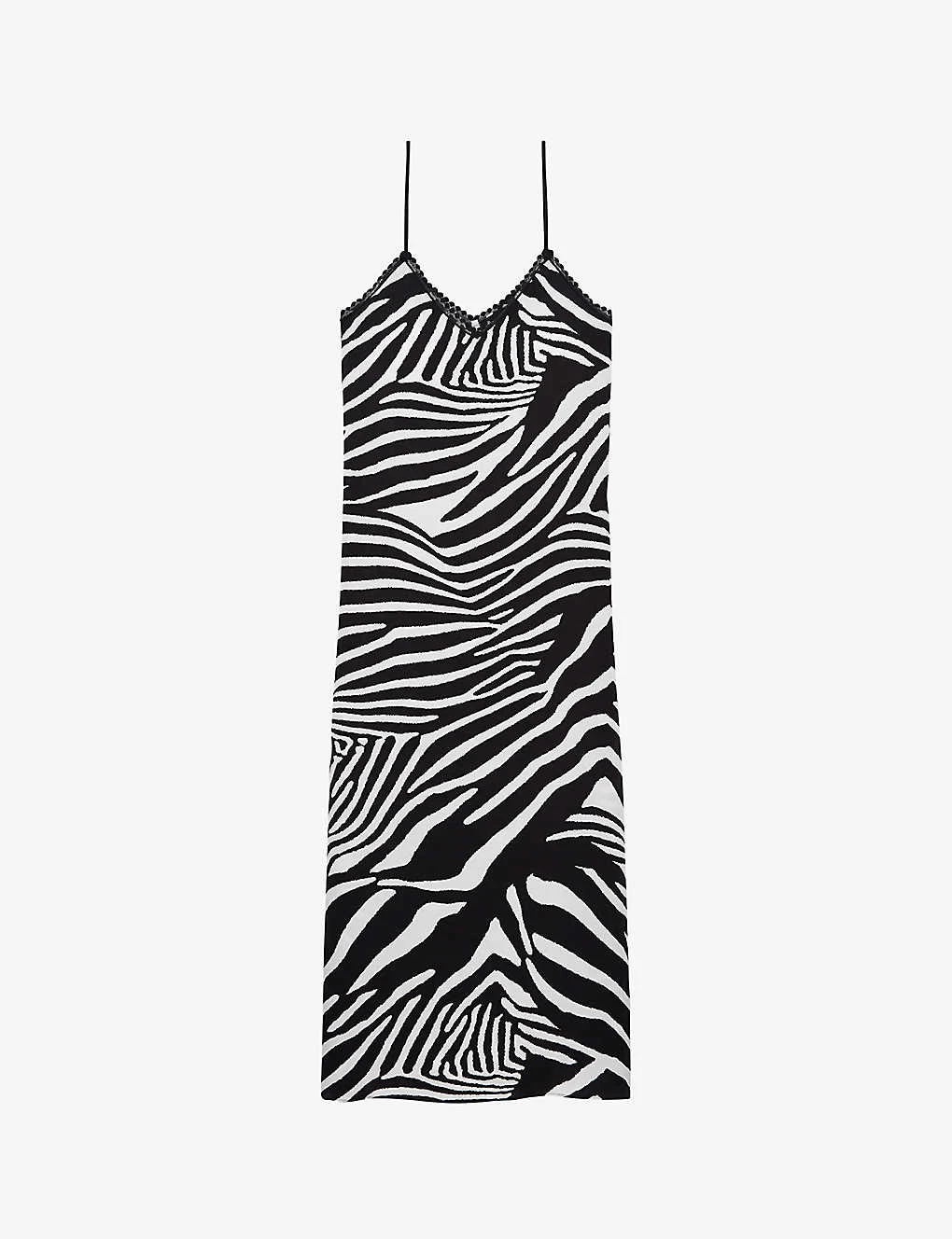 - Spaghetti shoulder straps, V-neck, lace-trim along neckline, all-over zebra print