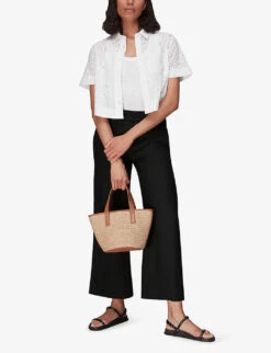 - Regular fit, high rise, flared leg, belt loops, five pockets, brand patch at back, branded hardware, floral cut-outs at hem