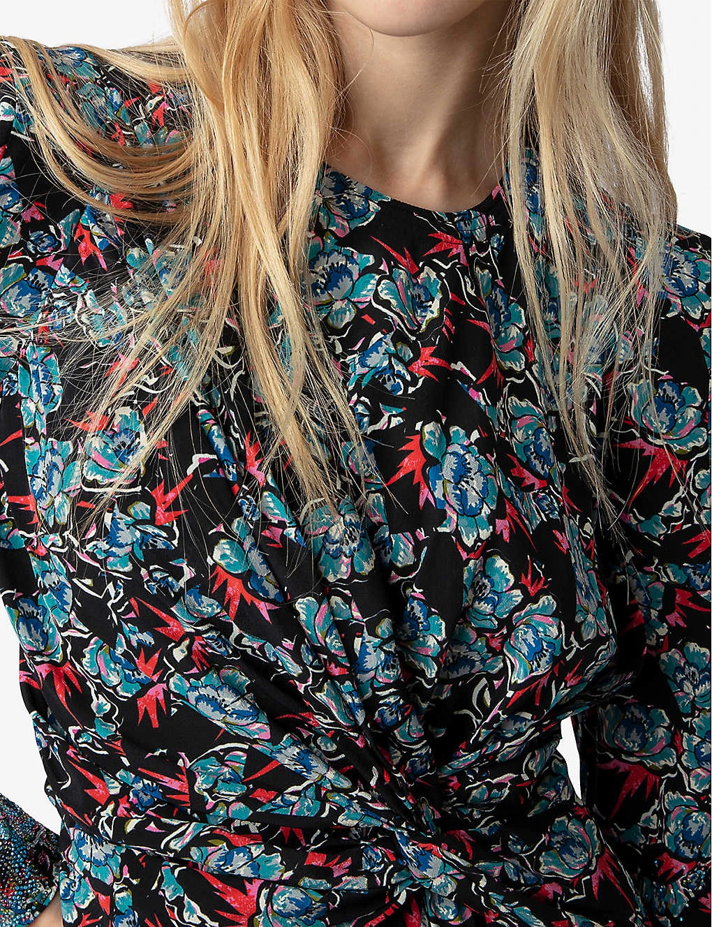 - Slim fit, round neck, long sleeves, mini length, all-over floral print, diamante embellishment, twisted gathering at front, padded shoulders