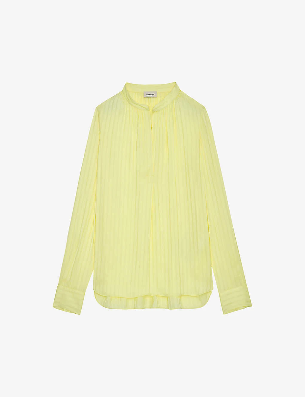 - Mandarin collar, long sleeves, all-over striped pattern, pleated at front, buttoned cuffs, raised hem at front, long hem at back, all-over satin finish